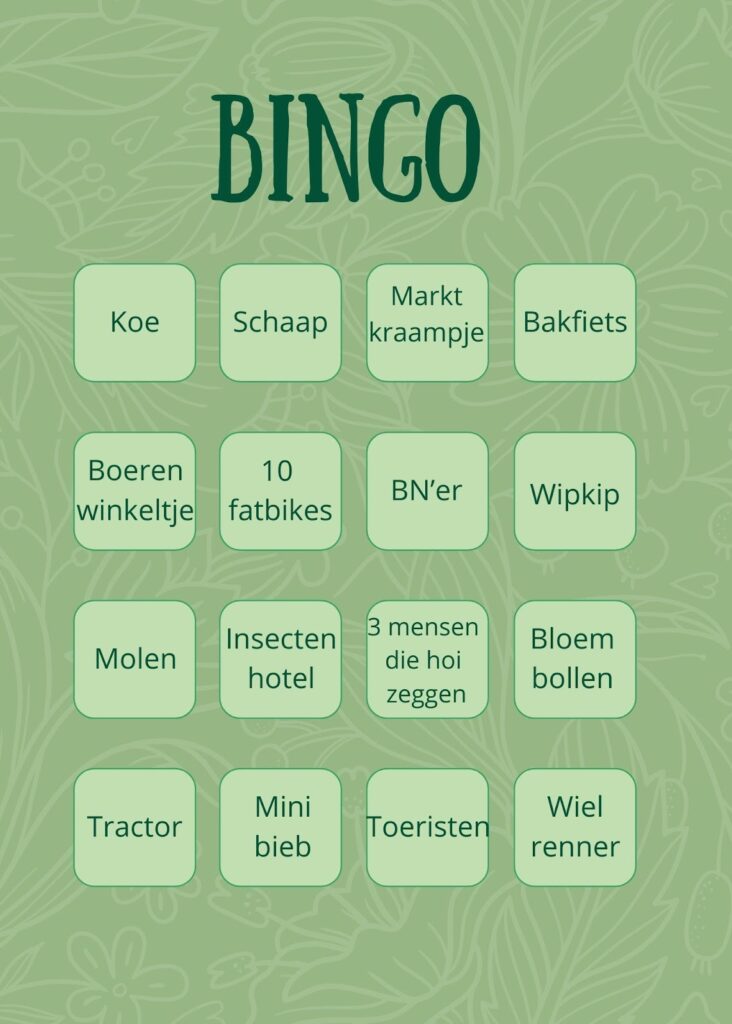 Wij hebben onderweg een bingokaart gemaakt met allemaal dingen die je onderweg tegen kan komen. Soms is het even zoeken, maar eigenlijk loop je tegen de meeste dingen zo aan.